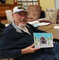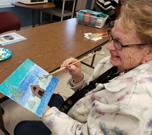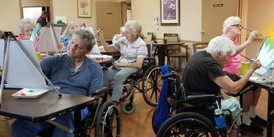 Artist and seniors meet in a fun filled class creating craft projects and paintings while socializing